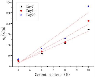 Table 5. Fitting formula of unconfined compression strength of solidified sludge under different curing agent dosage conditions.