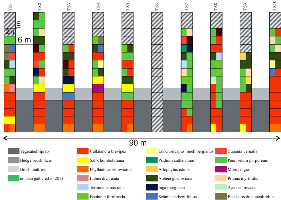 ary in 2010. The intervention was executed in the following sequence: Firstly, the vegetated riprap was realized by using Calliandra brevipes Benth. and hardwood cuttings of Salix humboldtiana Willd. Above, hedge brush layers of the species Terminalia australis Cambess. Schinus molle L., Schinus terebentifolia Raddi. and Pouteria salicifolia (Spreng.) Radlk. were installed. In the upper portion, trees of Salix humboldtiana were anchored to the slope, using wooden poles and steel wires. Even further up, in the same way, trees of Enterolobium contortisiliquum were anchored to the slope but without the expectation of sprouting. As a final measure, the top angle of the slope was corrected and seedlings and hardwood cuttings of Phyllanthus sellowianus Müll. Arg. were fielded on its middle portion. After heavy rainfalls, a second vegetative intervention was implemented to ensure the physical integrity of the margin. Its purpose was to support the vegetated riprap, the hedge brush layer and the anchored willows. Particularly as the anchored trees of Enterolobium contortisiliquum had been removed dur- ing the heavy-rainfalls, an additional action became necessary. The aim is to enhance the biodiversity on site, but also for test- ing various species in terms of their applicability for soil bioen- gineering interventions a wide range of species was used. Fig- ure 3 shows a technical sketch with all the applied soil bioen- gineering techniques and the used plants. The plant material consisted of 1550 seedlings of 32 native species.