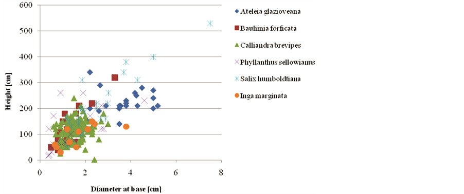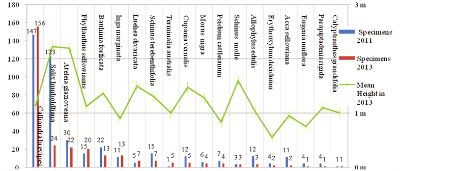 In Table 2, the species, which were found in the plant sur- vey in 2011 but disappeared until 2013, are listed. Particularly strong losses were seen with the species Machaerium para- guariense Hassl., Eugenia myrcianthes Nied. and Myrcianthes pungens Berg. Legr. In Figure 5, the species, which were found in both vegetation surveys plus their mean plant height are shown. The species which developed best are Calliandra brevipes, Phyllanthus sellowianus, Ateleia glazioveana, Salix humboldtiana, Bauhinia forficata Link and Inga marginata Willd. In Figure 6, the growth development of these species is illustrated. Salix humboldtiana, showed great losses in the number of individuals. However, it grew very strong and high- est of all species in the plant stand. The second highest grown species is Ateleia glazioveana. Its mean vitality was classified as 1 and only a few losses of plant individuals occurred. During the period of the monitoring, the plant individuals of Phyllan- thus sellowianus increased and showed significantly the best growth along the mean water level. The plant individuals of Bauhinia forficata showed a good development. The same ap- plies to Inga marginata, which could even increase the number of plant individuals. As well, Luehea divaricata Mart. and Inga marginata showed to be able to emerge on river embankments, as its number of individuals increased. Pouteria salicifolia, which was used in the hedge brush layer completely disappeared. Further species of the hedge brush layer are Morus nigra and Ter- minalia australis.