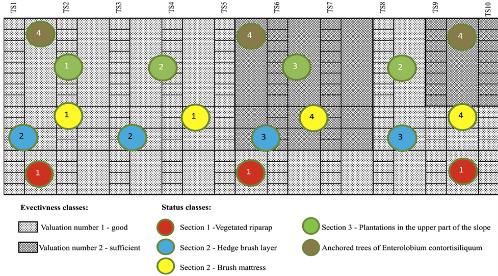 In Figure 6, the evaluation of the structures in terms of ef- fectiveness and status is shown. As a whole, the intervention can be assessed as functional and safe. The effectiveness of the structures in conjunction with the present vegetation is rated in the classification classes 1 or 2. This means that the embank- ment is well protected and no imminent failure should be ex- pected. Analyzing the structures separately showed some issues with the intervention. Only the vegetated riprap developed as it was supposed should have. In several spots, the implemented vegetation material did not or just sparsely emerge. Especially in the hedge brush layer and in the upper portion, where a wide range of species was fielded, the desired development was only partly achieved. The anchored willows showed a good devel- opment in half of the intervention, where high, vital brushes developed, making a major contribution to slope reinforce. In the other half, from transect 6 on, the brush mattresses could not develop at all. In the parts where the implemented vegeta- tion did not develop as desired, spontaneous vegetation over- took the role of erosion protection, and therefore erosion just occurred point wise. Since the anchored trees of Enterolobium contortisiliquum were swept away shortly after planting, that intervention was classified with the category “destructed”. Figure 7 shows the embankment before the restoration work in 2010 and after the monitoring in 2013.