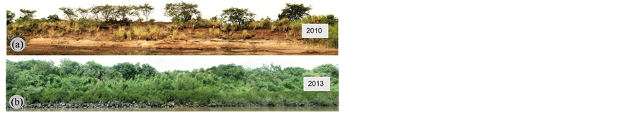 Figure 8 shows an overview of the situation before the in- tervention (2010) and after 3 years of plant development (2013). The “new” riparian forest based on the application of soil bio- engineering techniques fulfills technical as well as ecological functions. The generated forest provides bank protection against erosion and creates new ecological habitats. Further- more, the project shows that soil bioengineering techniques are