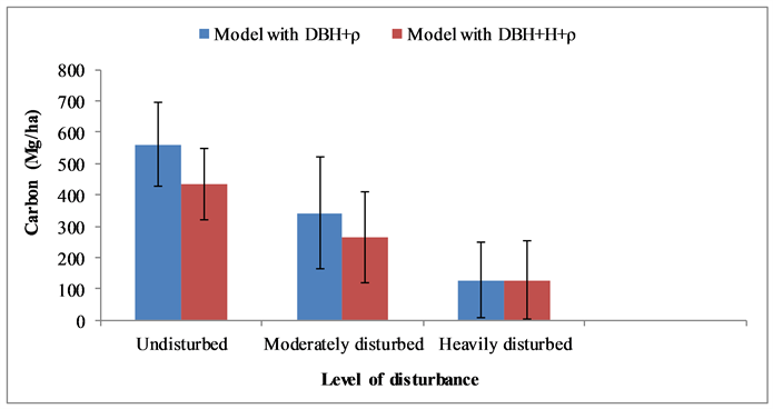 Figure 2. The quantity of carbon estimated in Chawia forest using two different biomass models at different levels of disturbance; error bars represents standard error of mean.