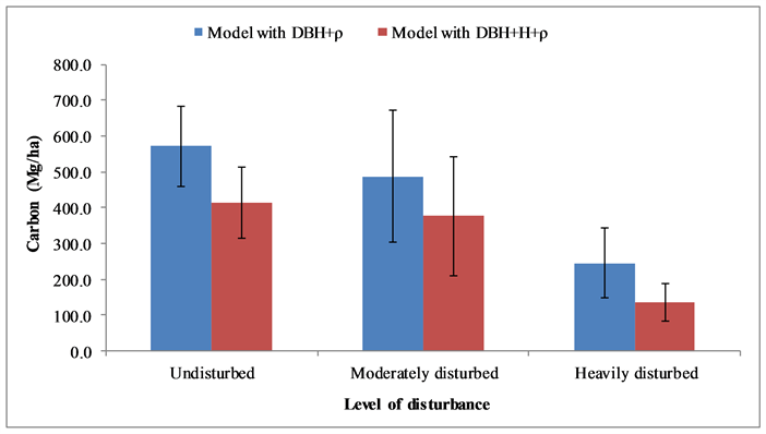 Models for estimating biomass which use diameter at breast height (DBH), height (H) and wood density (ρ) have been found to provide more accurate above-ground carbon estimates than those with DBH and ρ and DBH alone (Chave et al., 2005, 2014) . Our results indicate that the use of models with DBH and ρ to estimate carbon gave higher quantities of carbon sequestered in natural forest ecosystems than models with DBH, height and wood density (Figure 2). The estimated quantity of carbon sequestered in undisturbed sites in Chawia was 561.2 Mg∙ha−1 when the DBH and ρ model was used whereas the model with DBH, H and ρ gave carbon stocks estimates of 435.5 Mg∙ha−1. Similar trend was observed for moderately disturbed sites in Chawia where estimates of 341.5 Mg∙ha−1 and 266.5 Mg∙ha−1 were recorded for DBH and ρ and DBH, H and ρ models respectively. However, in heavily disturbed sites, both models gave carbon estimates that were more or less similar, 127.7 and 126.5 Mg∙ha−1 for DBH and ρ and DBH, H and ρ models respectively.
