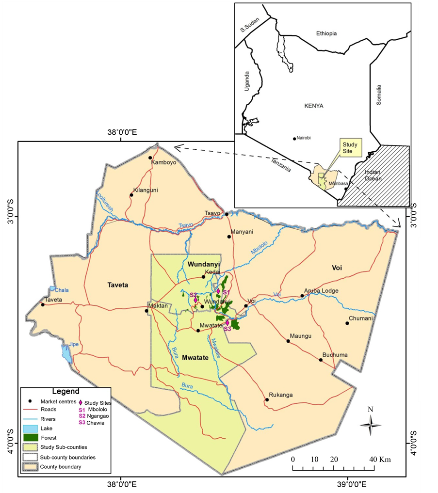 The study was undertaken in Taita Hills forests (3˚25'S, 38˚20'E) in Taita Taveta County. Taita Taveta County covers a total surface area of 17,084 Km2 and accounts for 2.94% of Kenya’s total surface area. It borders Tana River, Kitui and Makueni Counties to the North, Kwale and Kilifi Counties to the East, Kajiado County to the Northwest and the Republic of Tanzania to the South and Southwest. The temperature varies between 18.0˚C and 24.6˚C with the Hills experiencing lower temperatures of 18.2˚C compared to the lower zones with an average temperature of 24.6˚C. The average temperature in the Taita Taveta County is 23.0˚C. Taita Hills forests are located within the Inter-tropical Convergence Zone. The long rain season occurs from March to May and a short rain season between November and December, but the mist and cloud precipitation is a year-round phenomenon in the hills. The cloud forest fragments are restricted to areas receiving over 900 mm of annual precipitation, being above 1400 m altitude at the Southeastern slopes and above 1700 m altitude at the Northwestern slopes (Jaetzold & Schmidt, 1983) . The average annual rainfall is 1500 mm. The soils are predominantly cambisols originating from weathered gneiss and are often gravely to sandy-loamy and shallow (Sombroek et al., 1982) . The soils are well-drained and moderately fertile (Sombroek et al., 1982) .