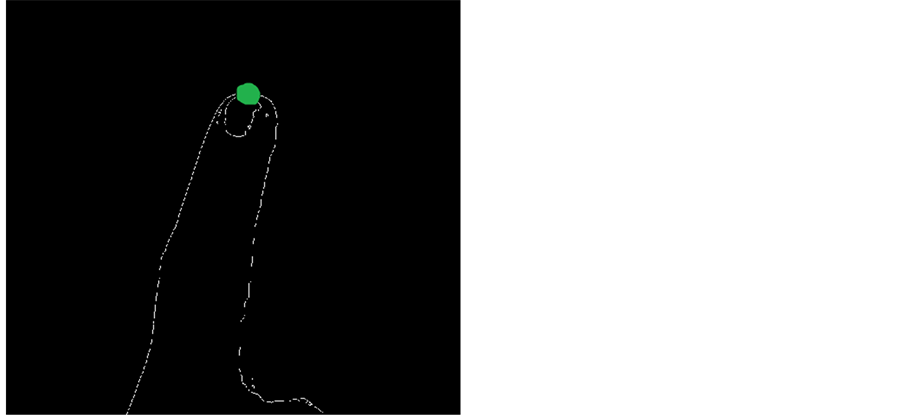 where, x, y, z, represent the edges of the triangle which can be represented as. This operation is used in traversing along the edge of the contour in an iterative manner and storing all output values. Once the operation is completed, the output with the smallest value is considered as the finger tip based on the assumption that the finger tip is the only area within the contour which produces the smallest output angle. The shadow extracted in the previous section is also processed for its tip in a similar manner. The results attained in fingertip detection are presented in Figure 5.