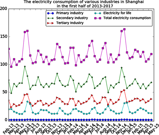 Electricity consumption data for various industries in the first half of 2013-2017: We collected data on electricity consumption in various industries in recent years from the Shanghai Municipal Government Data Service Network, including the primary industry, the secondary industry, the tertiary industry, household electricity, and total electricity consumption. The basic unit is billion kWh, and the chart shows the monthly electricity consumption and total monthly electricity consumption for each industry.