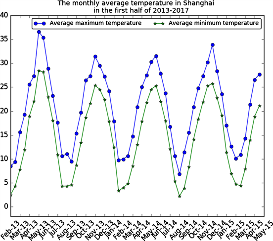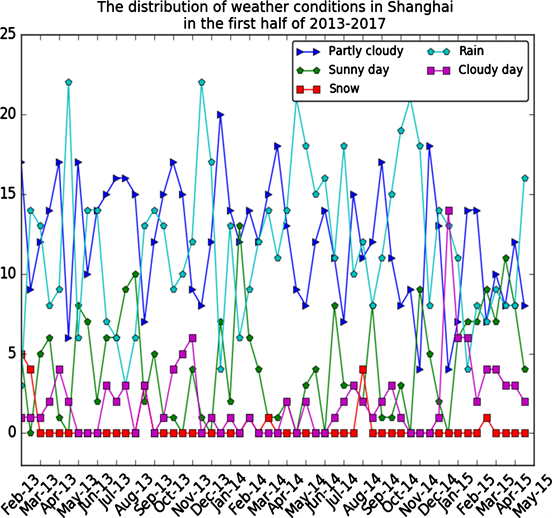 Monthly weather conditions for the first half of 2013-2017: We have not only considered the factors of GDP growth, but also considered the weather factor. We collected monthly specific weather conditions from the Shanghai Meteorological Network for the past few years, including the number of days of cloudy, sunny, cloudy, rainy, and snowy days (in Figure 2). In addition, the monthly average maximum temperature and average minimum temperature are collected in Figure 3. Figure 4 shows the monthly weather conditions in recent years.