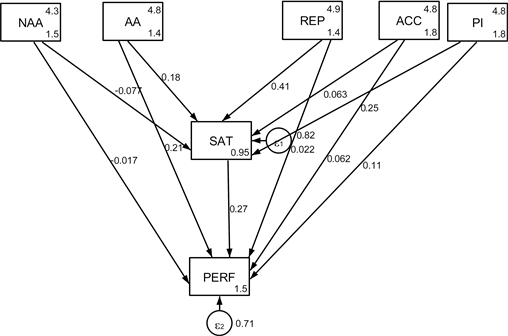 The study analysed the relationship between HEdPERF dimensions on one hand, and students’ satisfaction and academic performance on the other. Figure 1 shows the structural equation model that indicates the relationships.