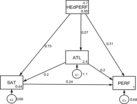 Figure 2. Structural relationships among HEdPERF, students’ satisfaction, attitude towards learning and academic performance.