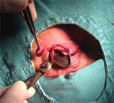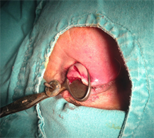 Figure 2. Local anesthesia application, the eyelid fixation using the chalazion tweezers and the incision of all lid layers.