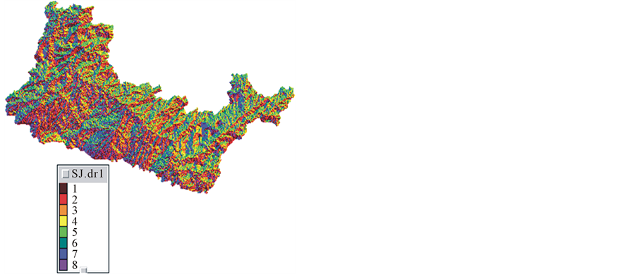 The spatially distributed model ATHYS are used to simulate the flow rates daily time in Sidi Jabeur station from 1996 to 2004. The calibration and validation period is respectively 1996-1999 and 2000-2004. To estimate the parameters of production and transfer models, a manual procedure by the sensitivity analysis had been used. From input data (digital terrain model, precipitation), the hydrological model ATHYS is used to define the daily runoff flow for each cells of Sidi Jabeur watershed, and also to obtain the drainage network, slope classes… etc. From the effective rainfall, SCS function defines the runoff depth. Moreover, unit hydrograph transfer function calculates the flows for each sub basins outlet, identified as nodes calculation (Ouljet Haboub and Sidi Jabeur). The DEM used is a set of elevation points (three coordinates, x, y and z) located every 90 m. The topography is reconstructed by the assembly of these points (Figure 3). The sub-mentioned data help to define the drainage network, slope classes (Figure 4), drainage directions (Figure 5), sub basins (Figure 6).