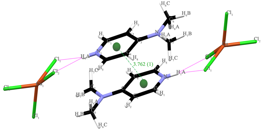 The geometric features of the organic cations are given in Table 3. The values of the bond lengths and angles are similar to those observed in bis(4-dimethylaminopyridinium) tetrachlorozincate [30] . The sum of the angles around the N(2) nitrogen atom is close to 360˚. The C3-N2 bond distance of the NH2 group is 1.341 (1) Å, which is short for a C-N single bond, but still not quite as contracted as one would expect for a fully established C=N double bond. This C-N bond length distance value is consistent with an imino resonance form as it is commonly found for a C-N single bond involving sp2 hybridized C and N atoms [31] . The shortening of the C-Namino bond distance is probably due to the delocalization of the ring π density with the p-orbital electrons of the