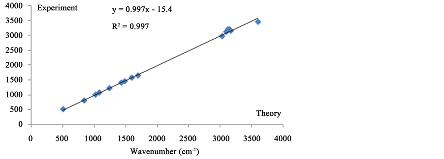 DFT calculations showed that the inorganic entities lead to vibrations below 500 cm−1 which are not observed experimentally in our conditions. So we focused only on the vibrations of the organic cation. X-ray diffraction data give C-H or N-H distances which are too small compared to what is usually observed (typically below 0.1 nm) due to the fact that this method is not sensitive to the nuclei but to the electrons and so gives values corresponding to distances between the barycenters of electronic charges. As a consequence, the positions of protons were first optimized, the C and N atoms being located at the positions given by the X-ray study. The resulting C-H and N-H distances corresponded to what is usually obtained (typically 0.109 nm for C-H and 0.104 nm for N-H) and the frequencies calculation was made on this semi-optimized geometry. The resulting IR spectrum, calculated by the B3LYP/6-311++G** method, is plotted on Figure 6 and is very similar to the experimental spectrum allowing a good correlation between the experimental and theoretical data as shown on Figure 7. Thus, the precision is well-sufficient to assign the experimental frequencies and to confirm the attributions proposed above.