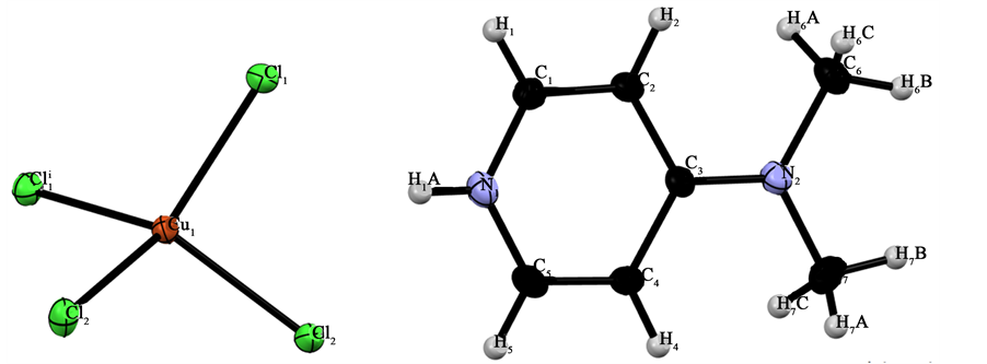 anions and 4-dimethylaminopyridinium cations (Figure 1). Only the pyridinium N atom is protonated, while the amine group remains unprotonated, resulting in a charge of +1 for the organic cation. Thus, to ensure charge equilibrium, the structure associates each tetrachlorocuprate anion with two 4-dimethylaminopyridinium cations. The copper ion lies on a special position (Table 2) and it has a coordination geometry intermediate between tetrahedral and square planar with the trans-