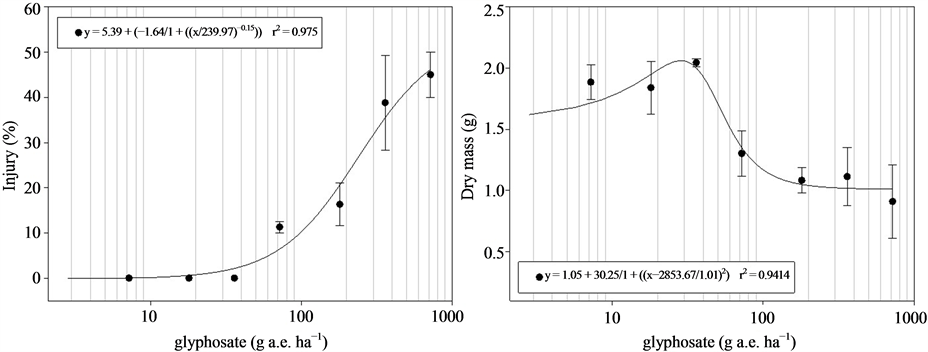 The dry mass of the plants was significantly reduces at doses of 72 g a.e. ha−1 and above, and there were signs of injury to leaves (Figure 3). However, plants produced greater biomass compared to the control treatment at doses ranging from 7.2 to 36 g a.e. ha−1 at 21 DAT. The stimulation of growth of a number of species subjected to low doses of glyphosate has been reported and discussed by various authors [37] -[39] . Glyphosate applications at the dose of 1.8 g a.e. ha−1 reportedly provided an increase in sugarcane shoot and root dry mass compared to plants that received no glyphosate application [40] .