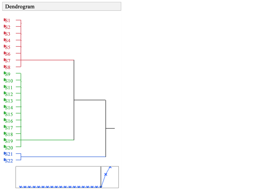 Figure 1. Dendrogram derived from the UPGMA procedure using genetic distances generated from the AMOVA program depicting the relationships among peanut accessions. Genetic distances are estimated from RAPD markers. Red = the first cluster which includes genotypes S1 to S8, Green = the second cluster which includes genotypes S9 to S20, Blue = outgroups S21 to S22.