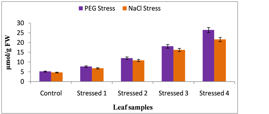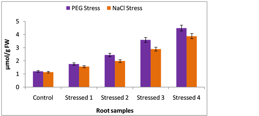Environmental stresses insists extensive lipid peroxidation, which has often been used as indicator of stress induced oxidative damage in membranes [28] . Total MDA content was estimated in control, PEG-stressed and NaCl-stressed seven days old seedlings root and leaf samples. The total MDA content was significantly increased in root and leaf samples of stressed seedlings over control seedlings under all stress regimes. A linear increase in MDA accumulation was observed with increasing PEG and NaCl stresses. MDA levels were ~8-fold and ~10-fold increase was seen in PEG and NaCl stressed leaf and root samples of foxtail millet seedlings respectively, than control root and leaf samples of foxtail millet seedlings at the end of experimentation (Figure 3 and Figure 4). Similarly, increase in MDA in response to drought and salt stress was also reported by many workers [26] . The increase in MDA levels under stress would result in membrane lipid peroxidation by means of ROS production [29] . The formation of ROS enhances lipid peroxidation at the cellular level and the rate of such enhancement relates to plant species and the severity of stress [30] .