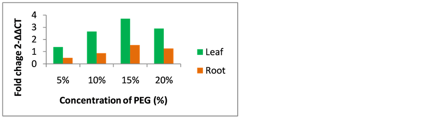 Figure 5. Quantification of foxtail millet AKR1 expression level in leaf and root PEG subjected samples by comparative CT.