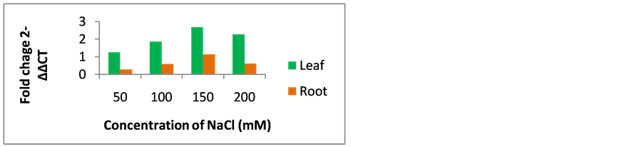 The qRT-PCR of foxtail millet AKR1 analysis showed significant expression in leaf and root tissues. In PEG stress conditions, foxtail millet AKR1 transcript expression showed 1.4, 2.6, 3.65 and 2.9-folds expression in 5% PEG, 10% PEG, 15% PEG and 20% PEG stressed leaf samples respectively, whereas 0.5, 0.9, 1.5 and 1.3- folds AKR1 expression was observed in 5% PEG, 10% PEG, 15% PEG and 20% PEG stressed root samples respectively (Figure 5). Foxtail millet AKR1 transcript expression was showed 1.3, 1.9, 2.6 and 2.3-folds in 50 mM NaCl, 100 mM NaCl, 150 mM NaCl and 200 mM NaCl stressed leaf samples respectively, 0.2, 0.55, 1.1 and 0.6-folds expression was observed in 50 mM NaCl, 100 mM NaCl, 150 mM NaCl and 200 mM NaCl stressed root samples respectively (Figure 6).
