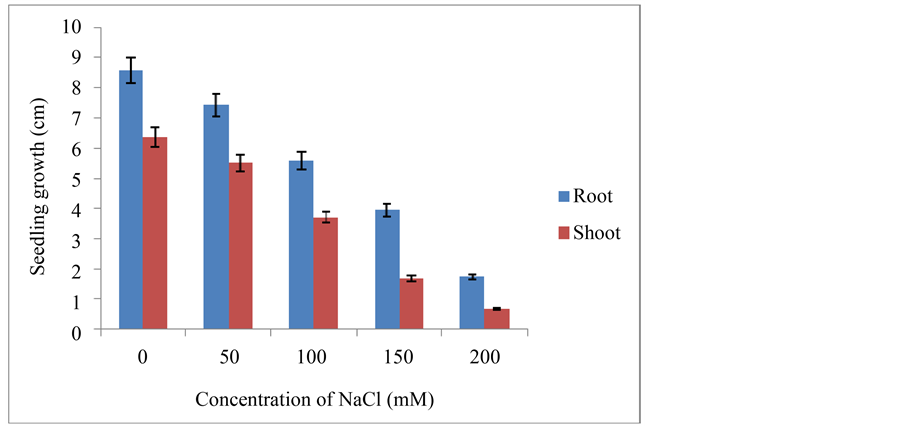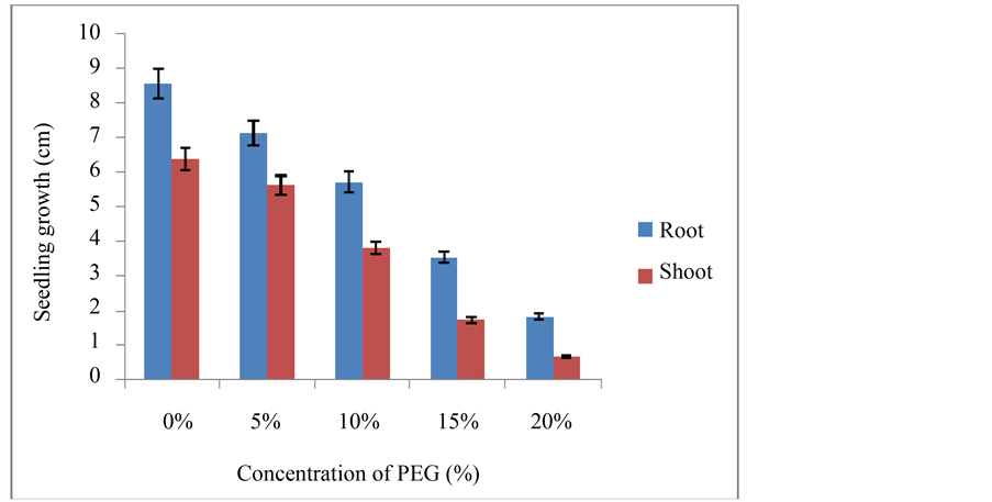 PEG and NaCl stress subjected seven days old seedlings were harvested and their root and shoot growths were measured and recorded. Mean values were depicted in Figure 1 and Figure 2.