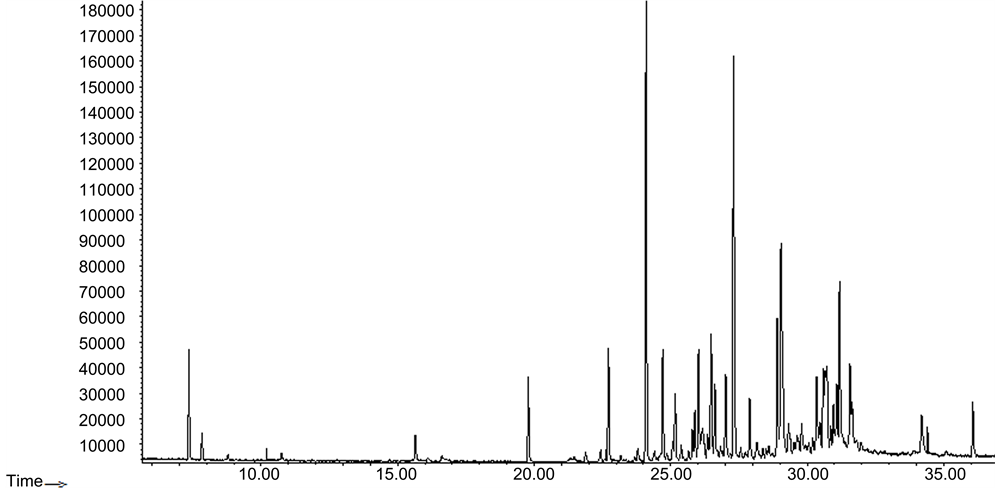 Inlet temperature and MSD detector temperatures were set at 270˚C and 290˚C, respectively. The GC oven temperature program was used as follows: from 60˚C - 246˚C at 3˚C/min and helium was employed as carrier gas (1 mL/min). The sample was dissolved in ethyl ether to give a 1% v/v solution. Injection size 1 μL using a split injection technique (split ratio 20:1) were used. MS were taken at 70 eV with mass range of m/z 41 - 300. Tetradecane (C14) as inner standard was used.