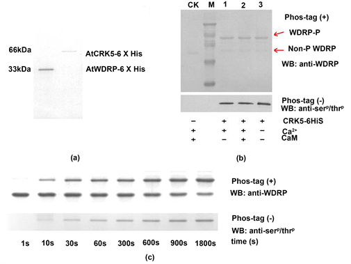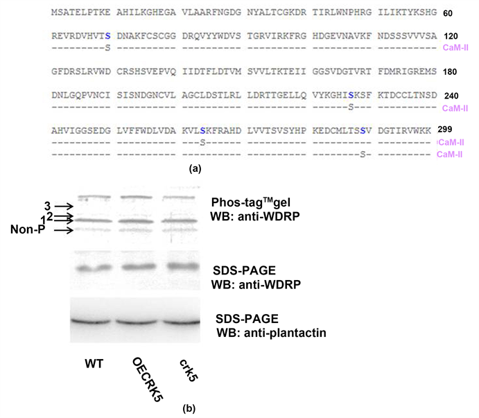 WDRP protein band. Based on the principles of Mn2+−Phos-tagTM SDS-PAGE, the band with slow mobility was phosphorylated WDRP. These results implied that WDRP can be phosphorylated by CRK5 and that phosphorylation does not dependent on calcium and calmodulin (Figure 3(b)).