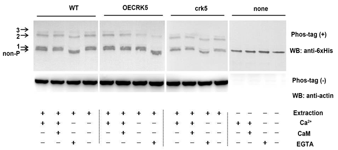 calcium ions) was added to the kinase reaction system, the phosphorylation state of WDRP was different from the other reaction conditions. In WT, OECRK5, and crk5 extraction systems, the phosphorylated WDRP-6×His band (marked 3) was almost missing, which result implied that this phosphorylation state of WDRP was dependent on calcium (Figure 4). In addition, separation of the phosphorylated forms by Phos-tagTM SDS-PAGE requires the presence of Mn2+ in the running gel [3] . As shown in Figure 4, if MnCl2 was omitted from the running gel (divalent cations were somewhat chelated with EGTA), all WDRP species migrated more quickly than the other conditions.
