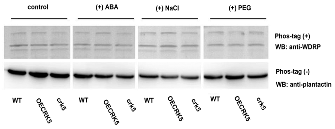 We also detected the phosphorylation state of WDRP in the OECRK5 transgene line and the crk5 line. In the OECRK5 transgene line, the CRK5 gene was over-expressed, while in the crk5 line, the CRK5 gene was knocked out. No differences were found in the phosphorylation state of WDRP among WT, OECRK5, and crk5 (Figure 2(b)).