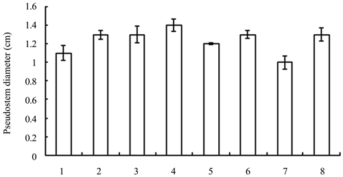 Figure 7. Pseudostem diameters of seedlings treated with different growth retardants. 1 - 8 represented paclobutrazol, dniconazole, paclobutrazol + brassins, paclobutrazol + diethyl aminoethyl hexanoate, dniconazole + brassins, dniconazole + diethyl aminoethyl hexanoate, chlormequat chloride, water, respectively.