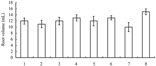 Figure 8. Root volumes of seedlings treated with different growth retardants. 1 - 8 represented paclobutrazol, dniconazole, paclobutrazol + brassins, paclobutrazol + diethyl aminoethyl hexanoate, dniconazole + brassins, dniconazole + diethyl aminoethyl hexanoate, chlormequat chloride, water, respectively.