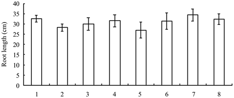 Figure 9. Root length of seedlings treated with different growth retardants. 1 - 8 represented paclobutrazol, dniconazole, paclobutrazol + brassins, paclobutrazol + diethyl aminoethyl hexanoate, dniconazole + brassins, dniconazole + diethyl aminoethyl hexanoate, chlormequat chloride, water, respectively.