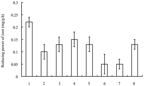 Figure 10. Reducing powers of the roots of seedlings treated with different growth retardants. 1 - 8 represented paclobutrazol, dniconazole, paclobutrazol + brassins, paclobutrazol + diethyl aminoethyl hexanoate, dniconazole + brassins, dniconazole + diethyl aminoethyl hexanoate, chlormequat chloride, water, respectively.