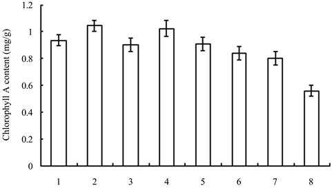 Figure 11. Chlorophyll A contents of seedlings treated with different growth retardants. 1 - 8 represented paclobutrazol, dniconazole, paclobutrazol + brassins, paclobutrazol + diethyl aminoethyl hexanoate, dniconazole + brassins, dniconazole + diethyl aminoethyl hexanoate, chlormequat chloride, water, respectively.