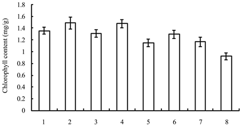 Figure 12. Chlorophyll contents of seedlings treated with different growth retardants. 1 - 8 represented paclobutrazol, dniconazole, paclobutrazol + brassins, paclobutrazol + diethyl aminoethyl hexanoate, dniconazole + brassins, dniconazole + diethyl aminoethyl hexanoate, chlormequat chloride, water, respectively.