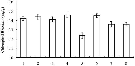 Figure 13. Chlorophyll B contents of seedlings treated with different growth retardants. 1 - 8 represented paclobutrazol, dniconazole, paclobutrazol + brassins, paclobutrazol + diethyl aminoethyl hexanoate, dniconazole + brassins, dniconazole + diethyl aminoethyl hexanoate, chlormequat chloride, water, respectively.