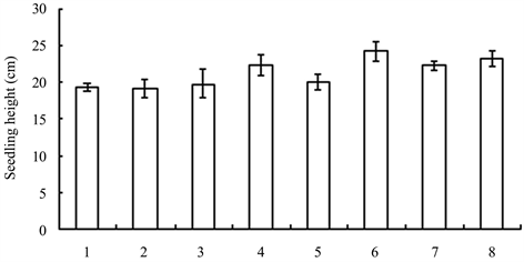 Figure 1. The heights of seedlings treated with different growth retardants. 1 - 8 represented paclobutrazol, dniconazole, paclobutrazol + brassins, paclobutrazol + diethyl aminoethyl hexanoate, dniconazole + brassins, dniconazole + diethyl aminoethyl hexanoate, chlormequat chloride, water, respectively.