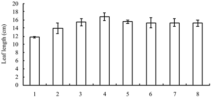 Figure 2. Leaf length of seedlings treated with different growth retardants. 1 - 8 represented paclobutrazol, dniconazole, paclobutrazol + brassins, paclobutrazol + diethyl aminoethyl hexanoate, dniconazole + brassins, dniconazole + diethyl aminoethyl hexanoate, chlormequat chloride, water, respectively.