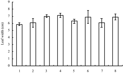 Figure 3. Leaf width of seedlings treated with different growth retardants. 1 - 8 represented paclobutrazol, dniconazole, paclobutrazol + brassins, paclobutrazol + diethyl aminoethyl hexanoate, dniconazole + brassins, dniconazole + diethyl aminoethyl hexanoate, chlormequat chloride, water, respectively.