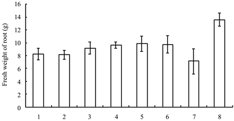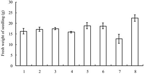 Figure 4. Fresh weight of seedlings treated with different growth retardants. 1 - 8 represented paclobutrazol, dniconazole, paclobutrazol + brassins, paclobutrazol + diethyl aminoethyl hexanoate, dniconazole + brassins, dniconazole + diethyl aminoethyl hexanoate, chlormequat chloride, water, respectively.