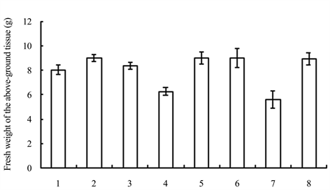 Figure 6. Fresh weights of the above-ground tissues of seedlings treated with different growth retardants. 1 - 8 represented paclobutrazol, dniconazole, paclobutrazol + brassins, paclobutrazol + diethyl aminoethyl hexanoate, dniconazole + brassins, dniconazole + diethyl aminoethyl hexanoate, chlormequat chloride, water, respectively.