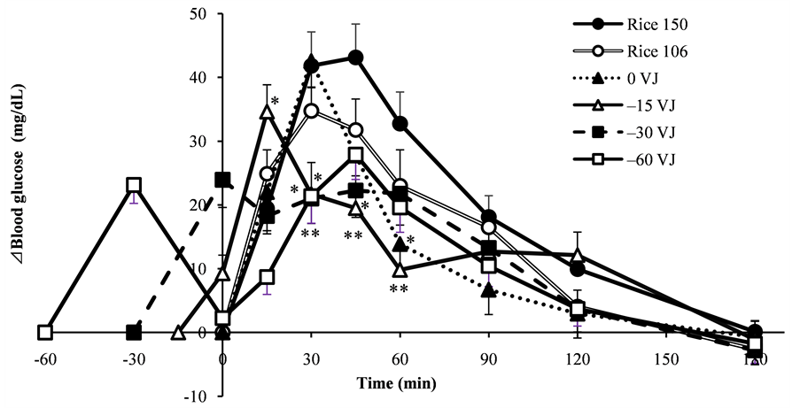 The time-dependent changes in Δblood glucose levels for each group are shown in Figure 1. The Rice 150 group exhibited an immediate increase after eating the rice, reached a peak at 45 min, and then decreased. The Rice 106 group exhibited lower Δblood glucose levels, compared to the Rice 150 group, but the differences at each time point were not statistically significant. The 0 VJ group exhibited essentially the same Δblood glucose levels up to 30 min, compared to the Rice 150 group, but the value at 60 min was significantly lower. The Δblood glucose levels in the −15 VJ, −30 VJ, −60 VJ groups increased after drinking the vegetable juice, but the Δblood glucose levels in those groups after eating the rice tended to be lower than the corresponding values in the Rice 150 group. The −15 VJ group exhibited lower Δblood glucose levels at 30 min, 45 min, and 60 min; the −30 VJ group exhibited lower Δblood glucose levels at 30 min and 45min; and the −60 VJ group exhibited lower Δblood glucose levels at 30 min.