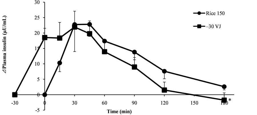Figure 2. The time-dependent changes in Δplasma insulin levels in each group during test 1. Data are presented as mean ± SE. *p < 0.05 vs. Rice 150.