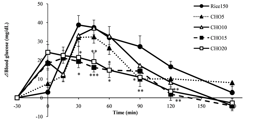 The time-dependent changes in blood glucose levels for each group are shown in Figure 3. The results in the Rice 150 group were almost identical to the results from Test 1. There were no statistically significant differences when we compared the changes of Δblood glucose levels in the carbohydrate (CHO) 5 and CHO 10 groups to those in the Rice 150 group. The Δblood glucose levels in the CHO 15 and CHO 20 groups were lower than those in the Rice 150 group at 30 min, 45 min, 60 min, and 120 min.