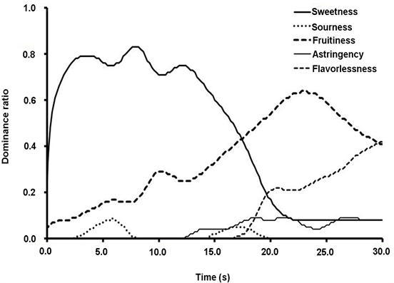 A previous study using the TDS method showed temporal changes in six sensations, including sweetness (by sucrose) and fruitiness (by strawberry flavor), 100 s