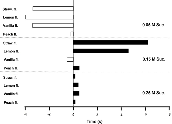 The average durations of the sweetness sensation varied among the three sucrose concentrations and among the four flavors (Figure 3). The overall average durations for the three sucrose concentrations across the flavors were −1.6 s (0.05 M sucrose), −1.9 s (0.15 M sucrose), and +1.4 s (0.25 M sucrose). The situations of the durations related to sucrose concentrations were more complicated and less consistent than the times mentioned above: for example, the duration for the strawberry-flavored sample showed a positive value at a 0.05-M sucrose concentration, but the other three samples showed negative values, whereas a completely opposite situation occurred at a 0.25-M sucrose concentration (Figure 3).