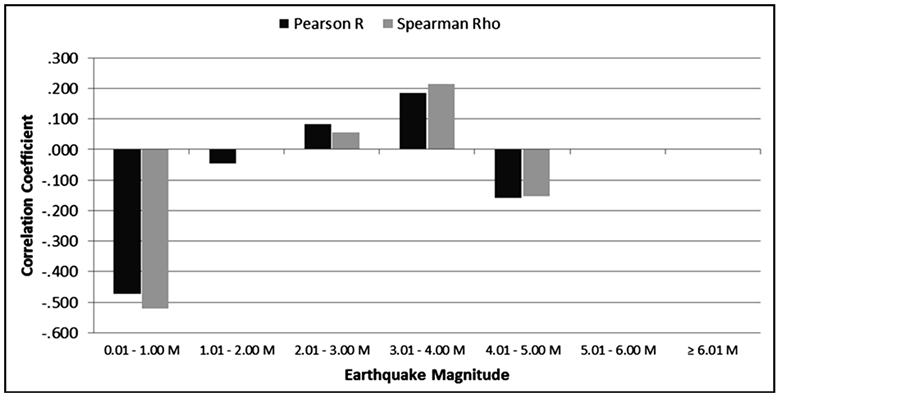 The results of the correlation analyses (parametric and non-parametric) between the variation in daily solar flux units (SFU) and the daily average energy per event released within the successive 1 M increments of earthquakes are shown in Figure 1. The strongest and most statistically significant association was between the lowest magnitude (0.01 to 1 M) quakes and the energy associated with SFUs.