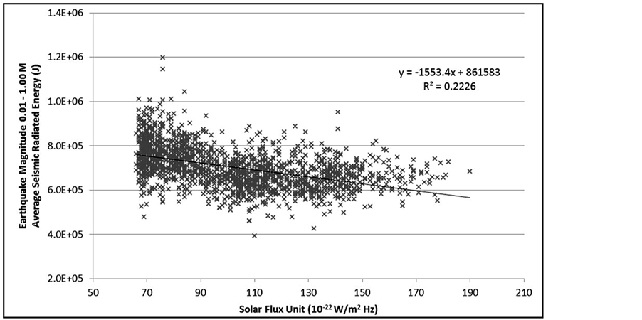 The daily solar flux units displayed a strong negative relationship [rho = −0.51; r = −0.48, p < 0.001] with the daily average event energy for those recorded magnitudes between 0.01 - 1.00 M. In other words about 25% of the variance between the daily fluctuations in solar flux units and average earthquake energy within that band was shared. The strengths of the associations between the power of the solar flux activity and the other intervals