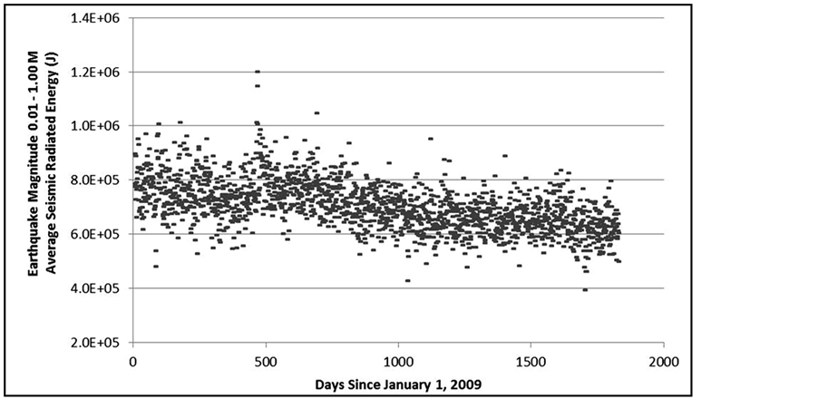 A scattergram with the results of regression analysis of the significant relationship over the 1826 day period from 2009-2013 between the average seismic radiated energy (J) for those Earthquakes of magnitude 0.01 - 1.00 M and the daily solar flux unit is shown in Figure 2. The slope indicated that for every 1 SFU unit decrease there was an increase of 1.55 × 103 J per average earthquake within that interval of magnitude. To visualize the temporal development of the two major variables the actual values over real time for the five year period were graphed. Figure 3 shows the average energy per seismic event within the 0.01 to 1.0 M range over the five year period. Note the negative slope that is evident visually. Figure 4 shows the average power flux density for SFU units over time during the same period. In addition to the general positive slope there were conspicuous positive fluctuations.