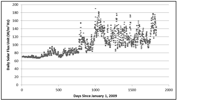 Figure 4. NOAA Penticton solar flux unit (W/m2 Hz) F10.7 cm index as measured daily at local noon (2000 UT) for each day between 1 January 2009 and December 2013.