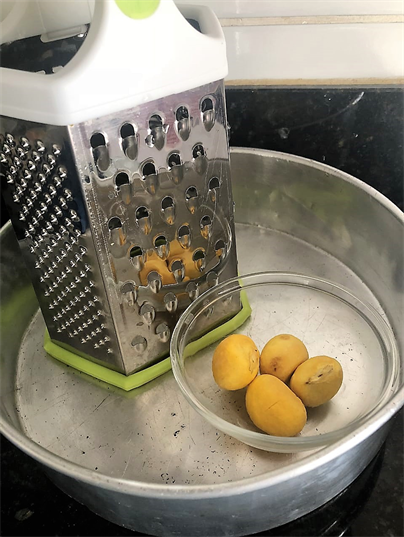 3) The pequi fruits were subjected to friction on the cutting surface of the stainless steel grater, obtaining the slices of the pulp (see Figure 1). After the removal of pequi pulp, the product was thawed to a temperature of 10˚C, then arranged in trays and led to a convective dryer with air flow.